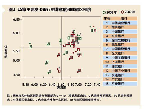 图1是一个满意度—体验区别度的象限图,在上面可以看到15家主要发卡银行的分布。其中,平安银行是在2009年才上榜的。从图中可以看到,招商银行无论是在体验区别度还是满意度方面,比其他竞争对手的得分都明显高一些。两年中,招商银行在满意度和体验区别度两方面排名都最靠前;其他银行在2008年的分布比较分散,但在2009年越来越贴近了。对照2009与2008两年的表现,它们与招商银行的距离并没有拉近,但互相之间的差异化程度却愈来愈低。