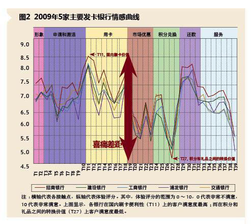 图2是2009年招商银行、建设银行、工商银行、浦发银行和交通银行这5家主要发卡银行的情感曲线。之所以选择这5家银行,是因为在调查时得到的关于它们的反馈数据是最多的。这些情感曲线涵盖了信用卡客户的整个客户生命周期,包括从品牌及企业形象(T1~T2体验接触点),到申请和激活(T3~T10)、用卡(T11~T18)、市场优惠(T19~T23)、积分兑换(T24~T28)、还款(T29~T32),最后到服务(T33~T39)等7个环节,覆盖了大部分客户体验的主要接触点。根据客户在不同接触点上的体验评分,得到了各银行不同的情感曲线。