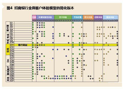图4展示了招商银行的全面客户体验流程模型的简化版本。横坐标表明,信用卡消费者通过不同环节,包括形象(T1~T2)、申请和激活体验(T3~T10)、用卡体验(T11~T18)、市场优惠体验(T17~T23)、积分兑换体验(T24~T28)、还款体验(T29~T32)和服务体验(T33~T39)等接触点,获得他们的体验。纵坐标则是客户获得这些体验的渠道,包括面对面(C1~C5)、电话与手机(C6~C10)、在线(C11~C15)、邮寄(C16~C20)、商户(C21~C22)、媒体(C23~C24)及其他(C25~C27)。