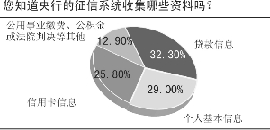 对此,本报联合新浪财经调查显示,对于央行征信系统收集的个人基本信息、贷款信息和信用卡信息等三类主要信息,网友的认知程度较高,而对于部分地区对公用事业缴费、公积金或法院判决的信息收集,只有12.9%的网友表示知晓。
