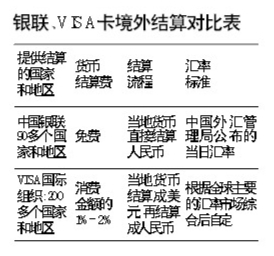 据了解,境外消费的费用一般有两种:一种是汇兑手续费,另一种是取现手续费和取现利息。目前内地提供信用卡服务运营商一般是银联、VISA和MASTERCARD。而我们手中的信用卡,也一般为具有银联和VISA标识的双币卡、银联和MASTERCARD标识的双币卡、银联单币卡。据建设银行佛山分行信用卡部相关人士介绍,人民币和美元双币信用卡比较常见,也有一小部分欧元卡,在香港或境外消费时,若当地结算的货币非美元也非人民币,就存在币种转换问题,双币信用卡消费的其他外币则都会折算成人民币或者美元才能入账。如此一来,通过VISA或者MASTERCARD等外卡线路刷卡,消费的当地外币会转换成美元,折算转换的同时会收取1%至2%的汇兑手续费;但通过银联的线路消费,当地外币就会直接折算成人民币,不加收汇兑手续费。走银联通道和V ISA通道的区别就在于货币转换费。