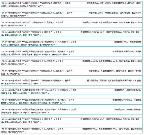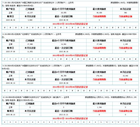 ②申请的贷款、多少张信用卡、账户信息、账户交易信息都在这一部分显示。显示持卡人所有账户中最近6个月平均使用额度、最大使用额度、还款日期、应还款额。从图中可以看出,该网友总共有13个信用账户数,这里值得注意的是,双币信用卡在个人信用报告张,提现的是2个账户数。上图中,网友就是一张光大银行的双币卡,有美元账户和人民币账户。
