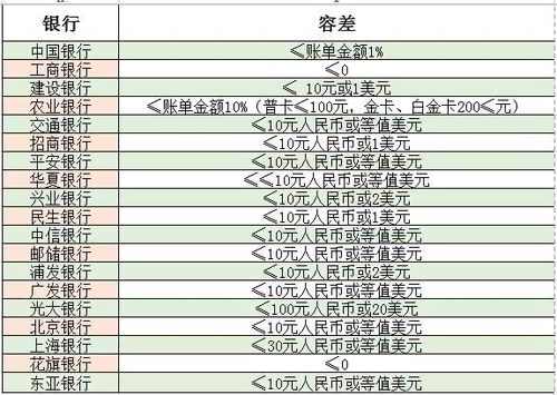 2、"容差逾期"指的是持卡人当期账单还款不足额,且到还款日后账户中还有未偿清的金额不超出银行规定的差额时,可视作持卡人全额还款,这部分未偿还的金额将会自动转入下期账单里,这类情况也不会视为不良征信。当然不同银行的差额也是不一样的,详情见下表。