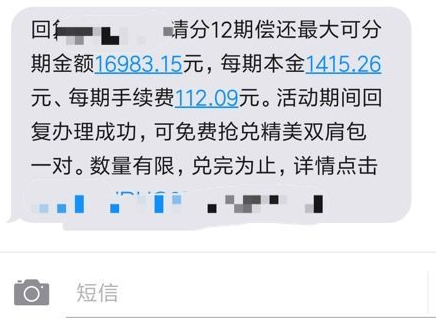 信用卡的出现极大地方便了我们的生活,出门消费不用带现金,带个信用卡就可以随处刷卡,而且信用卡刷卡消费还能享受各种各样的优惠,吃饭、看电影、商场购物打折、1元洗车优惠等活动都挺多的。而每一次账单日过后,看着常常的账单或许都发愁了,这时候银行一般都会贴心地发一个信用卡分期的短信给你,如下图: