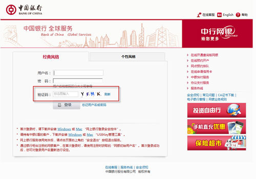3、控件安装完毕后,输入用户名、密码以及验证码,即可登录中国银行个人网上银行。